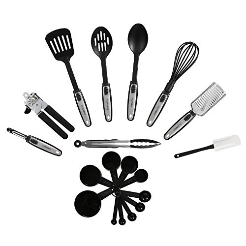 DURABLE AND VERSATILE DESIGN: Features a durable design made from heatproof nylon and stainless steel, to prevent scratching, scuffing or damaging your cookware. The ergonomic nylon grips and large handles throughout this kitchenware set ensure easy grip and maximum control while cooking. All tools among this 19Pcs set are dishwasher safe for easy clean up and minimizing cleaning time, except the can opener which should be hand washed. Equipped with hanging loops for convenient compact storage.
