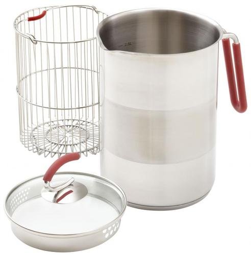 The 4th Burner Pot from Kuhn Rikon is perfect for a crowed stovetop. Made tall and thin, the stainless steel pot is a versatile superstar; includes a steamer basket, silicone-covered handle on both pot and steamer basket, pouring spout on pot and a glass top with holes for easy straining. Turn lid to close spout to keep liquid inside while cooking. Interior fill marks for easy measuring. Perfect for asparagus, vegetables, soups and many other dishes. 3.0-quart capacity. Dishwasher safe.18/10 stainless steel and aluminum sandwich base for optimum heat distribution, suitable for cooking on all stove tops including induction stoves