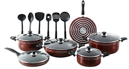 Size info : 7 inches x 3 inches casserole with glass lid capacity: 3 qt // 9 inches x 4 inches casserole with glass lid capacity : 5 qt // 11 inches x 5 inches casserole with glass lid capacity 8 qt // 12 inches x 3 inches wok with glass lid capacity 4 qt // 10 inches frypan with glass lid // 11 inches pizza pan // 6 pcs soft tools nonstick coating highly durable easy to clean even heat distribution comfortable soft-touch handles stay cool during use premium aluminum material for superior heat distribution and dual nonstick coating to deliver outstanding performance each time multipurpose use for home, kitchen or restaurant works great on gas or electric. Dishwasher safe but hand washing with warm soapy water is recommended to preserve the cookware's original appearance it is pfoa, lead and cadmium free. Scratch resistant.X-large full size set, please see description for size info